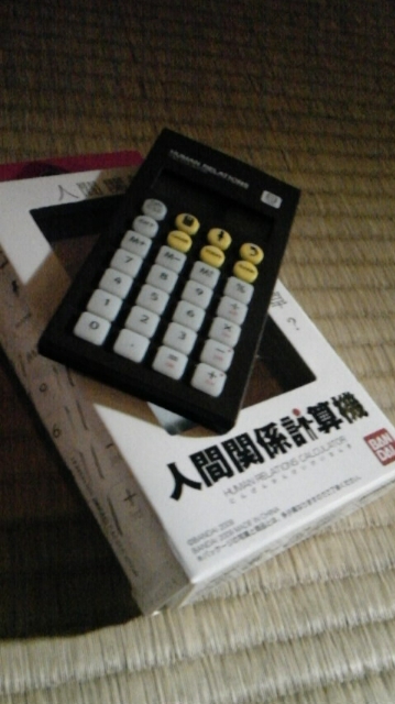 寝床から今晩は。画像は三百円ショップで只野ちゃんが見つけた人間関係計算機(普通に電卓としても使える)なるもの!これ人との相性が計算できて(?)遊べるという面白いシロモノ!帰りの特急で只野ちゃんと遊んでたら相性よすぎて笑えました。ちなみに帝黒メンバーでも面白い結果になったのでまたブログか漫画にしてのせたいと思います!他のアイシキャラ同士でもしてみたいー、コレ以外にも色んな機能がついていてかなり遊べる電卓でした!(^o^)!。後、電卓の他にも柄違いのおそろいでカードケース買いました!私はマトリョーシカ柄で只野ちゃんは猫柄です!画像は暗い写真ですが電卓もチョコレート色でボタンのおしごこちもよく、カードケースも軽くてやわらかくていい感じです!いいもの買ったー!(^o^)。猫柄のカードケースも可愛かったなぁ。